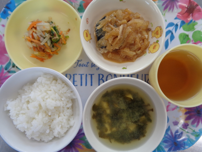 今日の給食は、ごはん、サバの味噌煮、白菜のお浸し、わかめの味噌汁です。