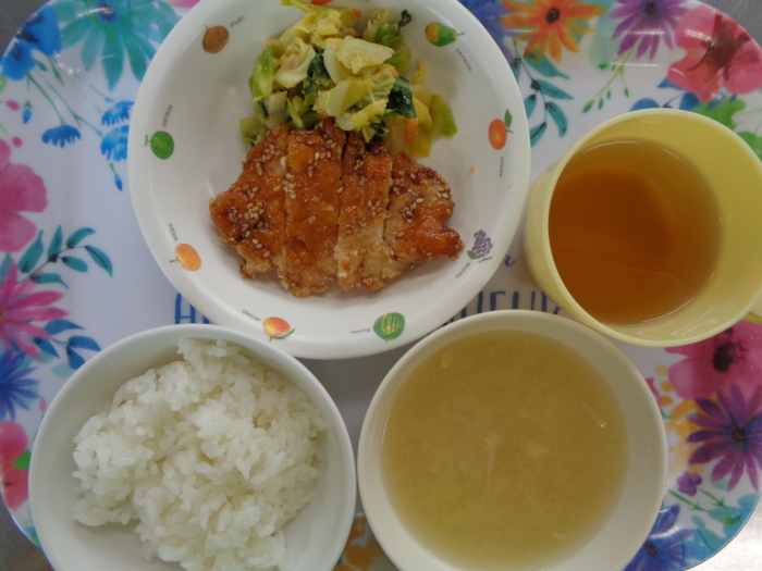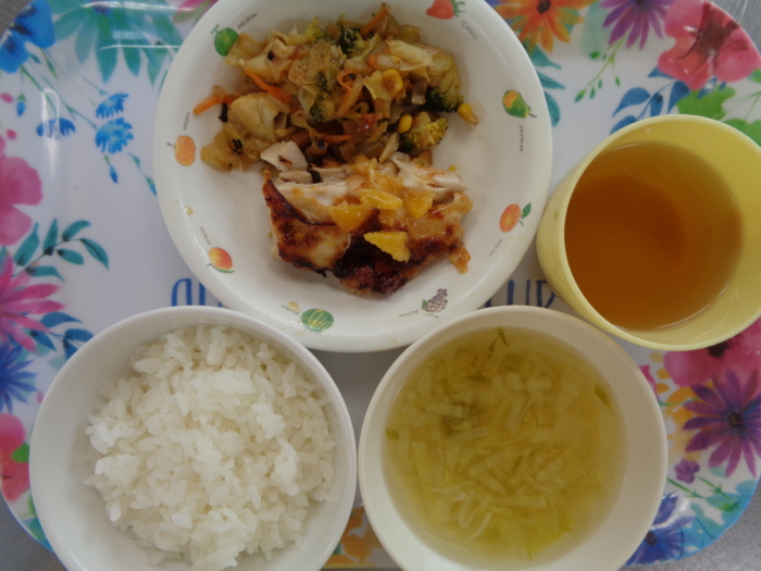 今日の給食は、ごはん、鶏肉のオレンジ焼き、花野菜のソテー、白菜のスープです。