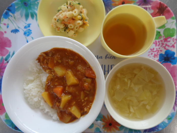 今日の給食は、ポークカレーライス、マカロニサラダ、キャベツの味噌汁です。