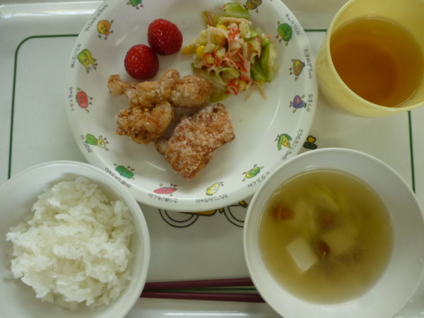 今日は、鶏の唐揚げ、春キャベツとカニカマのサラダ、なめこの味噌汁、ご飯、いちごです。離乳食初期は、おもゆ、うわ … “鶏の唐揚げ” の続きを読む