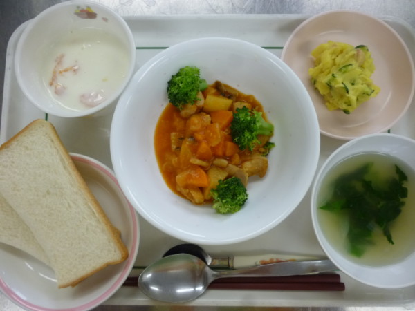 今日の献立は、食パン、鶏と野菜のトマト煮、さつま芋サラダ、小松菜スープ、みかんヨーグルトです。アレルギー食(乳 … “鶏と野菜のトマト煮” の続きを読む