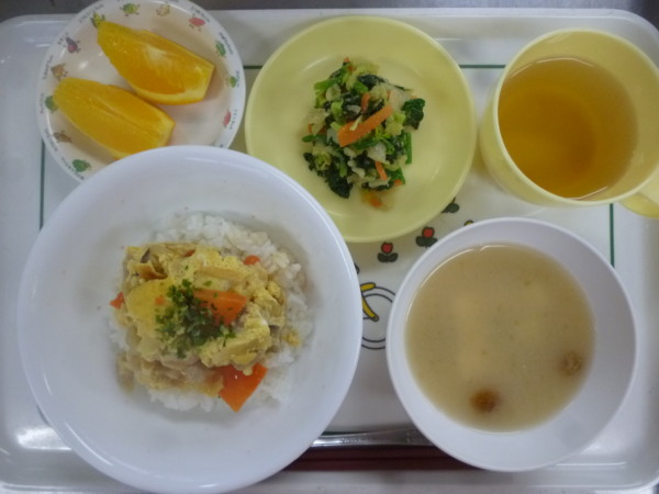 今日の給食は親子丼、ほうれん草のゴマ和え、なめこのみそ汁、オレンジです。アレルギー食(卵)は鶏丼です。離乳食( … “親子丼” の続きを読む