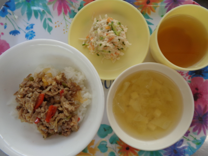 今日の給食は、焼肉丼、切干大根のサラダ、キャベツの味噌汁です。
