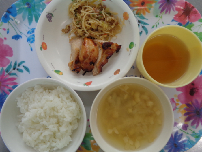 今日の給食は、ごはん、鶏肉の味噌焼き、野菜たっぷりビーフン、里芋の味噌汁です。