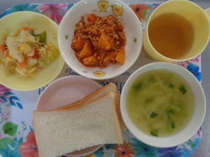 今日の給食は、食パン、ポークビーンズ、コーンサラダ、ワンタンスープです。