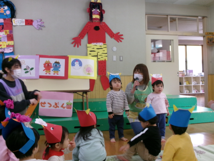今日はホールで節分集会をしました。今年は2月2日が節分なので、その由来を聞いたり、各クラスが作った鬼のお面を披 … “節分集会をしました(全クラス)” の続きを読む