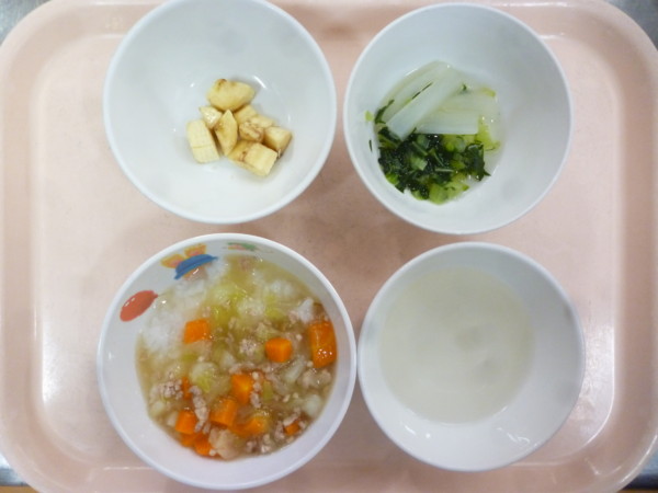 離乳食は、そぼろかけ粥(全粥、豚挽き肉、人参、じゃがいも、キャベツ)煮浸し(大根、小松菜)フルーツ(バナナ)です。