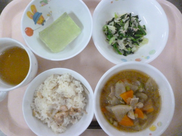今日の給食は、鶏きのこごはん 野菜のマヨ和え 豚汁 ゼリーです。