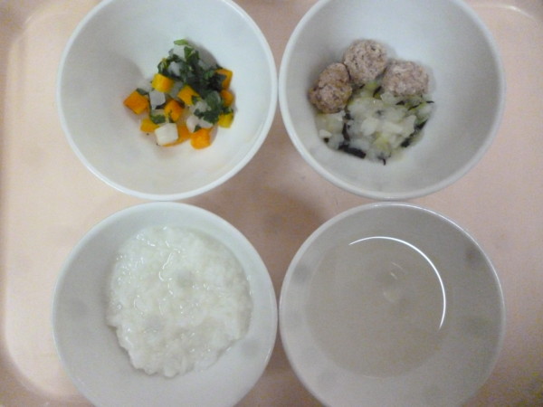 今日の離乳食は全粥 うわずみ 豚挽バーグ(豚挽き肉 ひじき じゃが芋 キャベツ) コロコロ野菜(人参 大根 ほうれん草)です。