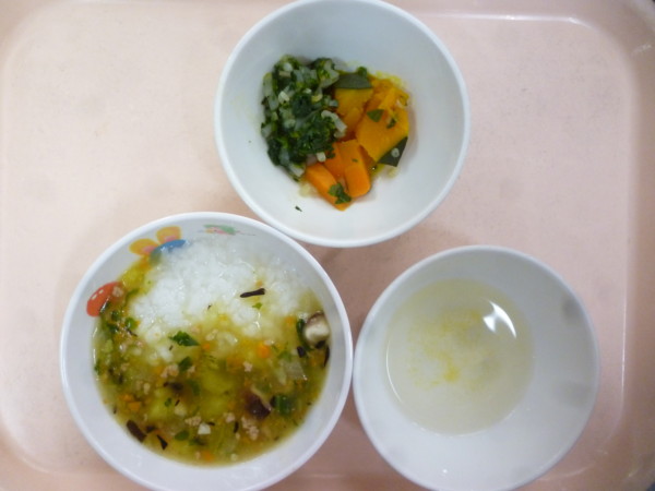 離乳食は、うわずみ 豚挽きと野菜のあんかけ粥(豚挽き肉、人参、さつま芋、玉ねぎ)もやしの煮浸し(もやし、ほうれん草、人参、かぼちゃ)です。