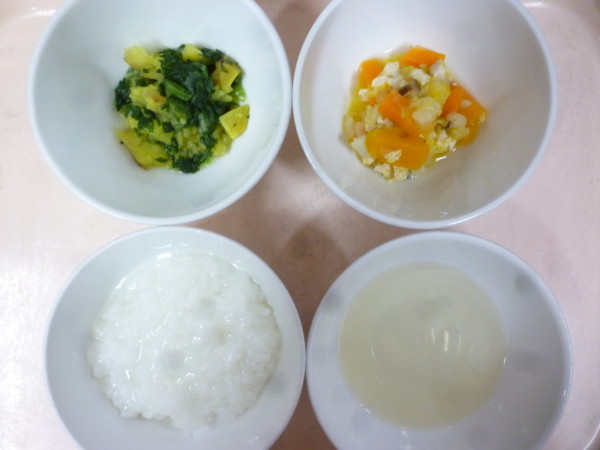 離乳食は、全粥 鶏肉と野菜の煮物(鶏むね肉、人参、かぼちゃ、白菜、しいたけ)さつま芋の甘煮(さつま芋、小松菜)です。