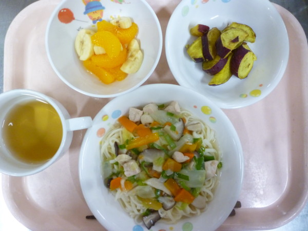 今日の給食は、鶏と白菜のあんかけうどん さつま芋の甘煮 フルーツ和えです。