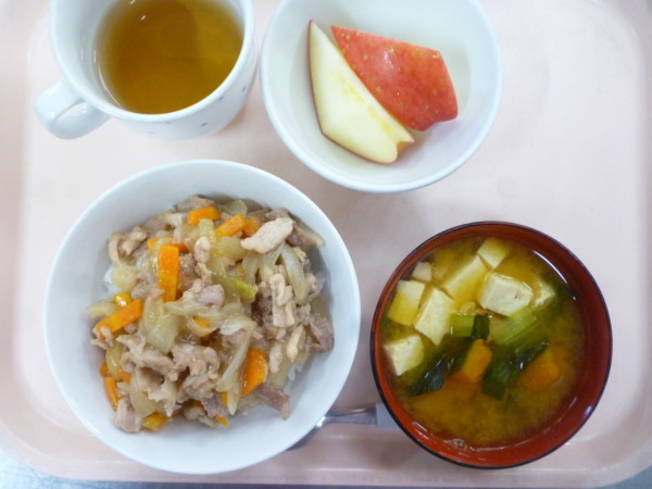 今日の給食は、豚玉丼(豚肉、人参、玉ねぎ)田舎汁(鶏もも肉、かぼちゃ、小松菜、木綿豆腐)フルーツ・りんごです