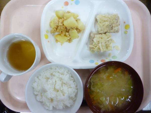 今日の給食は、ごはん かわりシュウマイ じゃが芋のオイスターソース炒め 春雨のごまみそスープです。