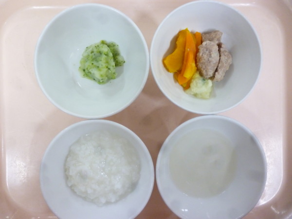 離乳食は、全粥 うわずみ ミニハンバーグ(豚挽き肉、玉ねぎ、人参、かぼちゃ、白菜)ブロッコリーとじゃがいもの和え物(ブロッコリー、じゃがいも)です。