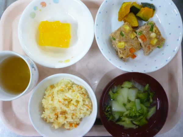 炊き込みピラフ カラフルハンバーグ かぼちゃソテー(3歳以上児)ブロッコリーとポテトのスープ フルーツ寒天です。