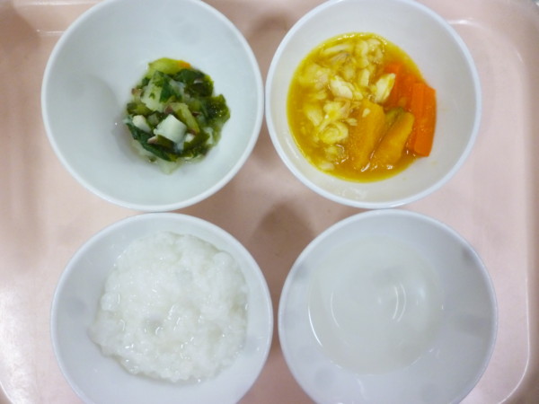 離乳食は、全粥 うわずみ 魚の野菜あんかけ(ホキ、人参、かぼちゃ)お浸し(チンゲン菜、しいたけ、生わかめ、じゃが芋)です。