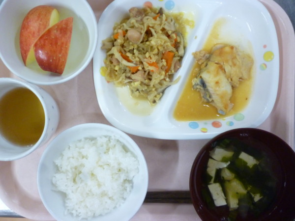 今日の給食は、ごはん 魚のみそ煮 切干大根とそぼろ大豆の煮物 すまし汁 フルーツです。