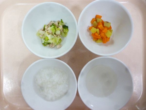 離乳食は、全粥 うわずみ 鶏肉と野菜の煮物(鶏肉、キャベツ、ブロッコリー)コロコロ野菜(人参、さつま芋)です。