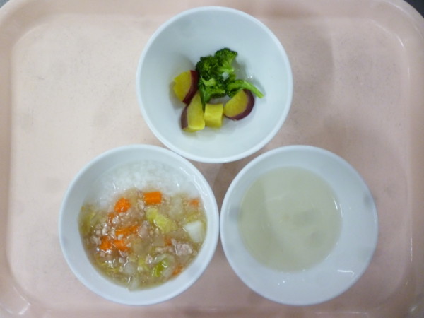 離乳食は、豚そぼろかけごはん(全粥、豚挽き肉、人参、さつま芋)お浸し(白菜、ブロッコリー )です。