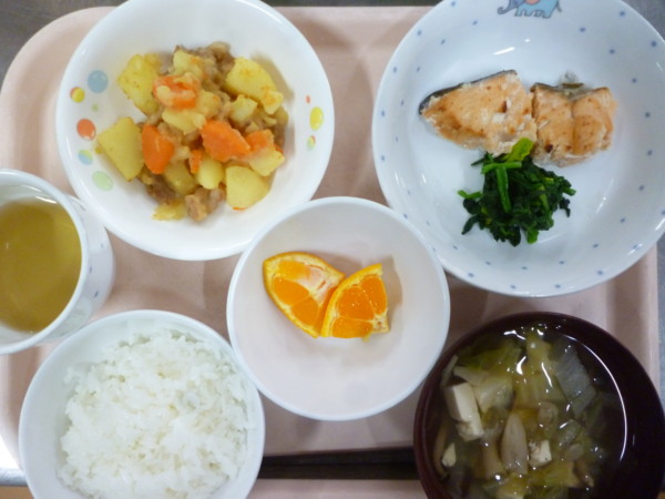 今日の給食は、ごはん 鮭の麹焼き 豚ばらじゃがみそ煮 すまし汁 フルーツです。