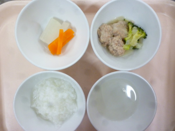 離乳食は、全粥 うわずみ 肉だんごと野菜の煮物(豚挽き肉、玉ねぎ、えのきだけ、さつま芋、ブロッコリー)スティック野菜(大根、人参)です。