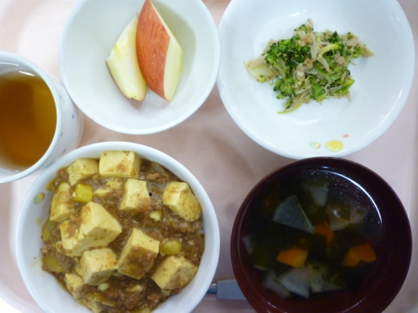今日の給食は、カレー麻婆飯 野菜ナムル 大根とわかめのスープ フルーツです。