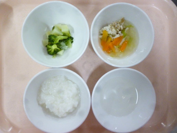 離乳食は、全粥 うわずみ 魚の野菜あんかけ(カレイ、人参、白菜)じゃが芋のお浸し(じゃがいも、チンゲン菜、小松菜、ブロッコリー)です。