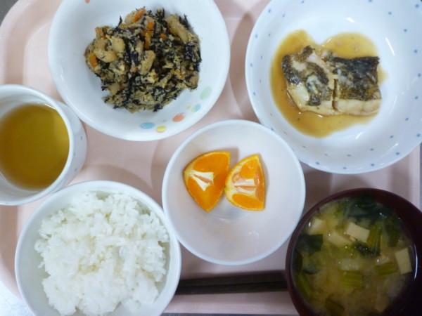 今日の給食は、ごはん カレイの煮付け ひじきとおからの炒り煮 納豆汁 フルーツです。