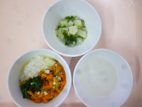 離乳食は、そぼろかけ粥(全粥、人参、ささみ、小松菜)お浸し(チンゲン菜、じゃが芋、生わかめ)です。
