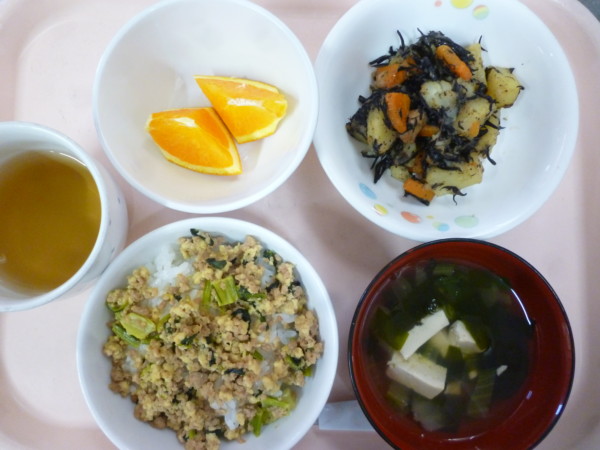 今日の給食は、そぼろかけごはん ひじきの炒り煮 すまし汁 フルーツです。