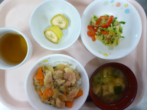 今日の給食は鶏あんかけ丼ぶり 和風コールスロー みそ汁 フルーツです。