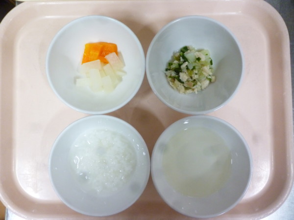 今日の離乳食は全粥 うわずみ ささみと野菜のみそ汁(ささみ 生しいたけ チンゲン菜 じゃが芋) スティック野菜(人参 大根)です。