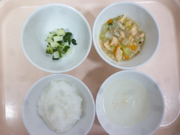離乳食は、全粥 うわずみ 鮭の野菜あんかけ(鮭、人参、大根、キャベツ、しめじ)モロヘイヤの煮浸し(モロヘイヤ、じゃがいも)です。