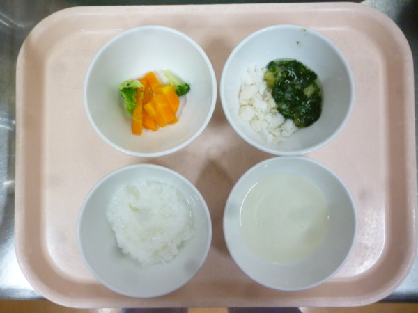 離乳食は、全粥 うわずみ 煮魚(ホキ、キャベツ、ほうれん草、なす)ブロッコリーのお浸し(ブロッコリー、人参)です。