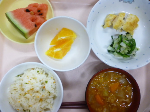 今日の給食は、炊き込みピラフ 魚のカレー風味揚げ レンズ豆のトマトスープ フルーツです。以上児さんは、スイカ割りをしたスイカがつきます。