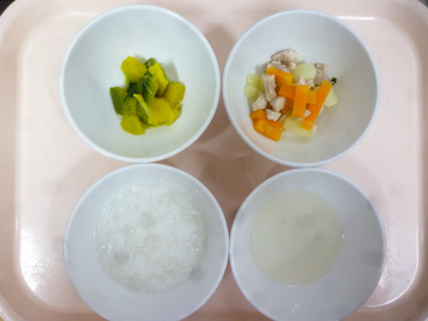 今日の離乳食は、全粥、うわずみ、鶏肉と野菜の煮物(鶏肉、じゃが芋、人参)煮浸し(かぼちゃ、小松菜)です。