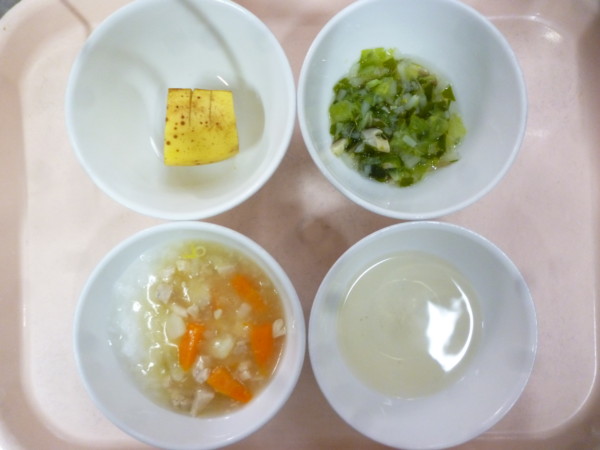 離乳食は 鶏挽肉の野菜あんかけ粥(全粥、鶏肉、人参、玉ねぎ、じゃがいも) うわずみ わかめの煮浸し(わかめ、もやし、しめじ、キャベツ) フルーツ(バナナ) です。
