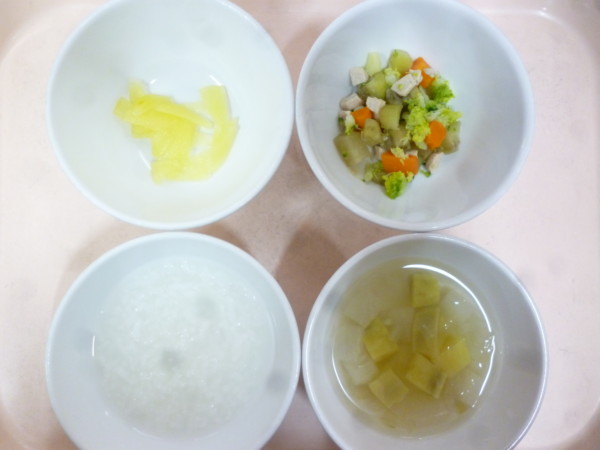 離乳食は 全粥 野菜スープ(玉ねぎ、大根、さつま芋) 鶏肉と野菜の煮物(鶏もも肉、人参、ブロッコリー、なす) フルーツ(りんご煮)です