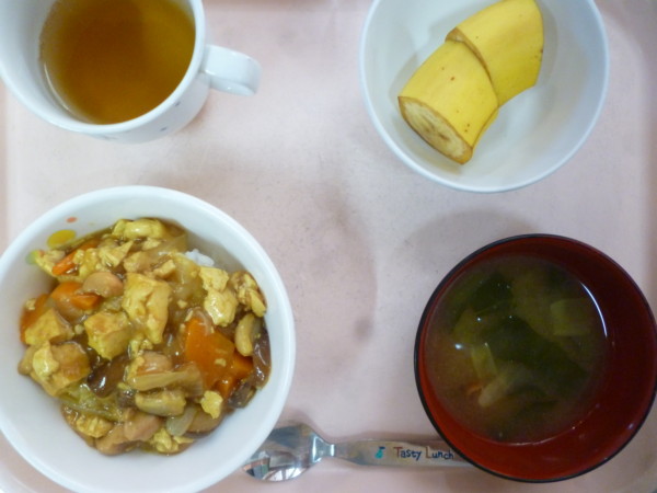 今日の給食は、 和風カレー丼ぶり なめこ汁 フルーツ(バナナ) です。