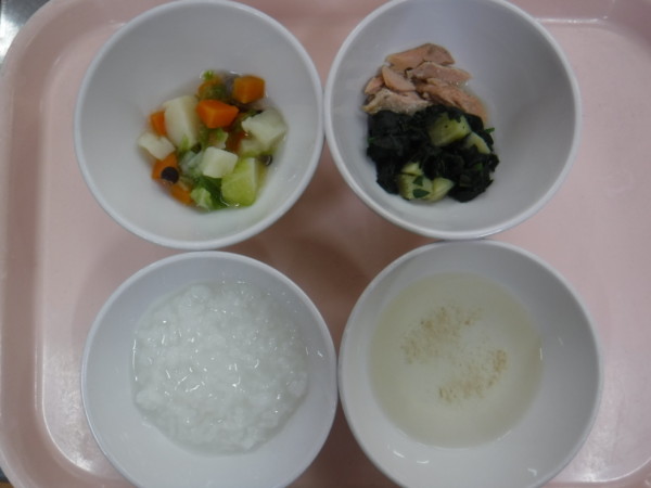 離乳食は、 全粥 うわずみ 煮魚(鮭) 付け合わせ(さつま芋、ほうれん草) 煮浸し(白菜、じゃが芋、しめじ、人参)です。
