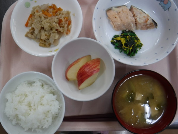 今日の給食は、 ごはん(サキホコレ) 鮭の麹焼き お浸し・菊花和え 切干大根とれんこんの炒り煮 豆腐と白菜のみそ汁 フルーツ(リンゴ)です。