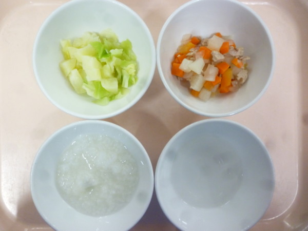 離乳食は 全粥 うわずみ 鶏肉と野菜の煮物(鶏肉、玉ねぎ、大根、人参、) キャベツのお浸し(キャベツ、じゃが芋) です。