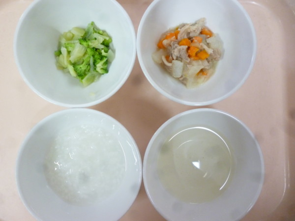 離乳食は、 全粥 うわずみ 豚肉と野菜の煮物(豚肉、人参、じゃが芋、大根、玉ねぎ) お浸し(キャベツ、ブロッコリー) です。