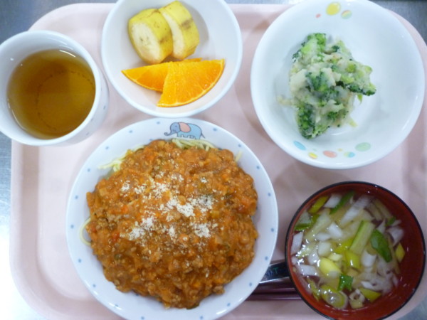 今日の給食は、 ミートソーススパゲティ ブロッコリーとじゃが芋のごま和え 豆腐スープ フルーツ(バナナ、甘平) です。
