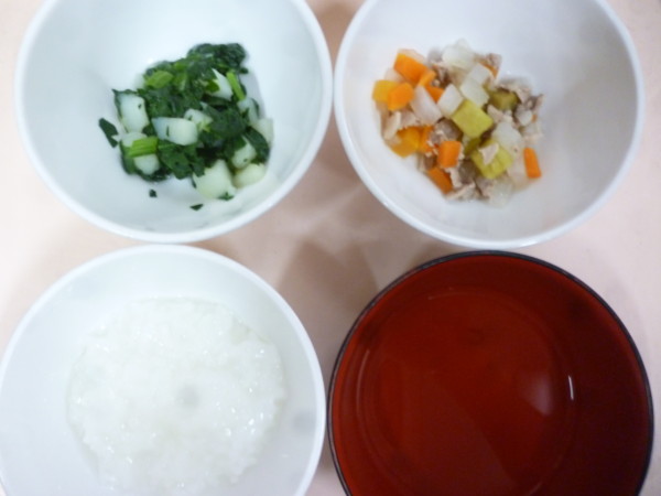 離乳食は、 全粥 うわずみ 豚肉と野菜の煮物(豚肉、大根、人参、さつま芋) 煮浸し(じゃが芋、ほうれん草) です。