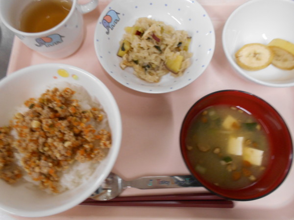 今日の給食は、 とろとろそぼろかけごはん 切干大根の煮物 バナナ なめこと豆腐のみそ汁 です。