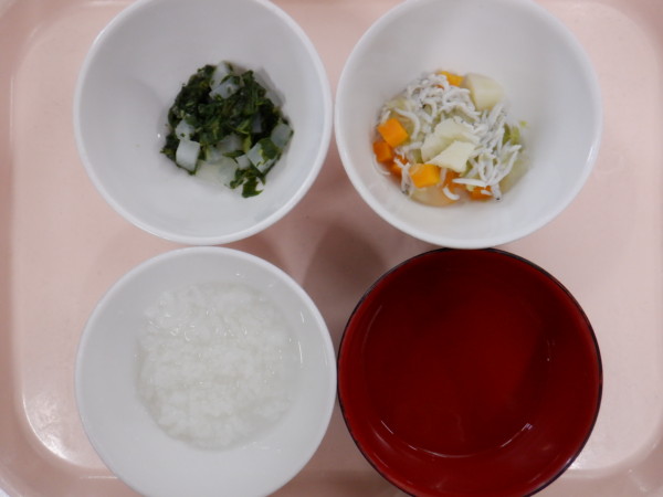 離乳食は 全粥 うわずみ しらすと野菜の煮物(しらす、人参、じゃが芋、キャベツ) 煮浸し(チンゲン菜、大根) です。
