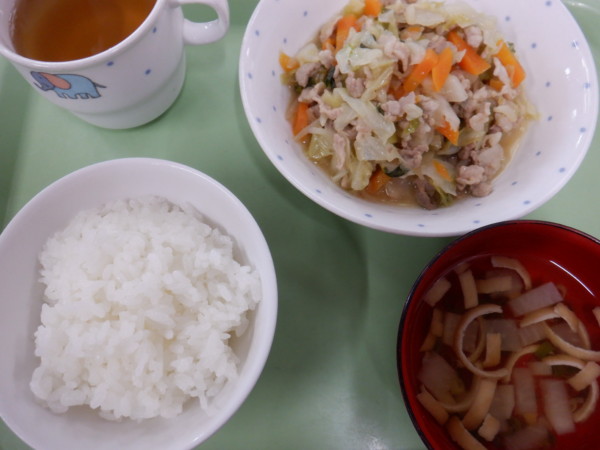 今日の給食は ごはん 豚肉と野菜のみそ炒め すまし汁 です。