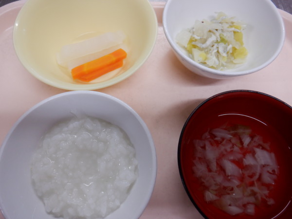 離乳食は、 全粥 うわずみ(キャベツ) しらすと野菜の煮物(しらす、さつま芋、玉ねぎ) スティック野菜(大根、人参) です。